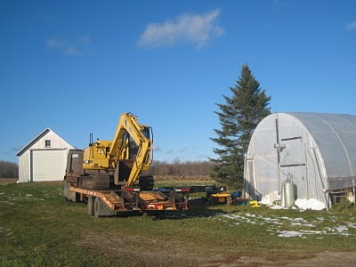 The excavator is in place…Dan and Bill figure it will just take a few days to excavate for the foundation, trench the wire a few hundred yards to the electrical box, and pour the foundation.