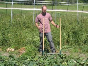 Each year we typically add a new tool or two to the farm arsenal. This year, after breaking about 5 potato forks last year, we picked up a broadfork from Johnnys in Maine (it’s even made in Maine). As you can see from the picture it is like a potato fork but with two handles. It’s a strong steel design with about 15 tines on the bottom that even I haven’t been able to break yet. A broadfork is designed for deep tillage or aerating ground so as to break up hardpan or the area at the depth of a plow or disk where the ground is quite hard. I use it to harvest potatoes and I’ve found it to work great for harvesting carrots where I can dig a foot and a half of the row instead of the 8 inches with a traditional potato fork. Cool.